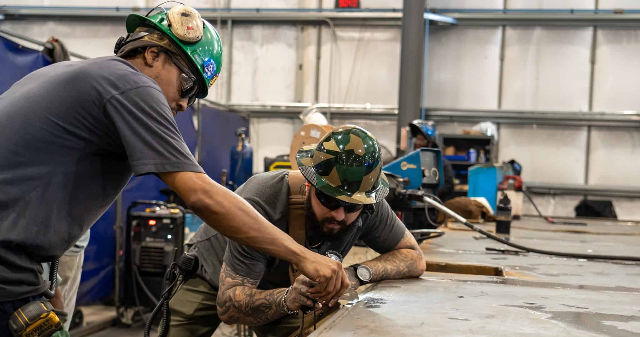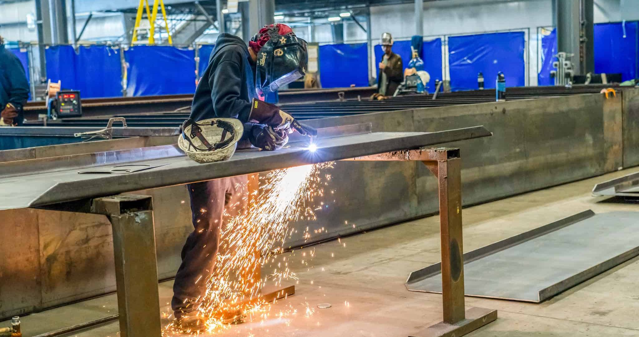 • welder working on fuel tank in Hudome Way manufacturing facility Acoustical Sheetmetal Company