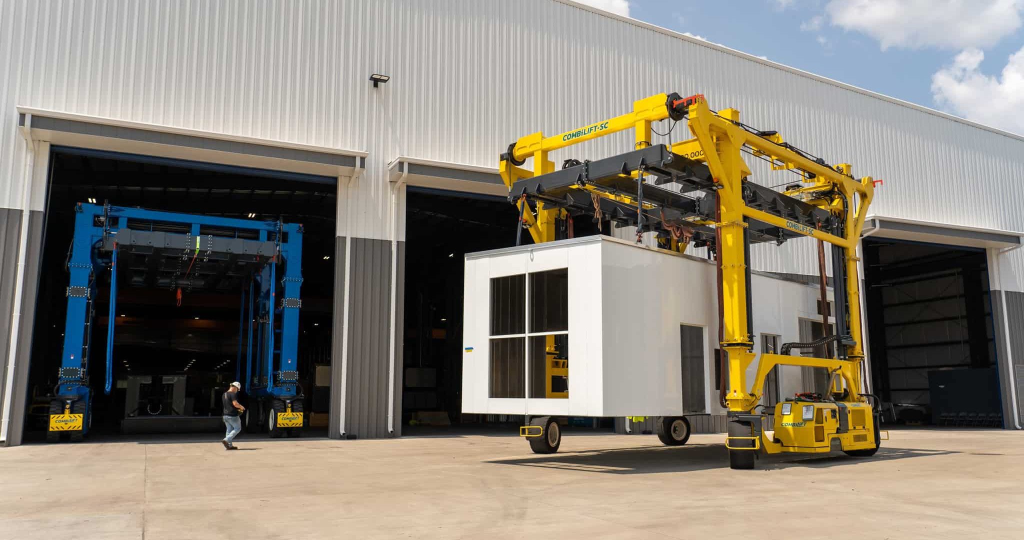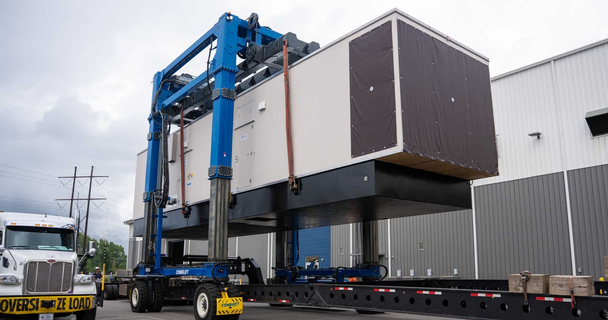 • A power generation enclosure being transported through ASC's manufacturing warehouse using a straddle carrier.